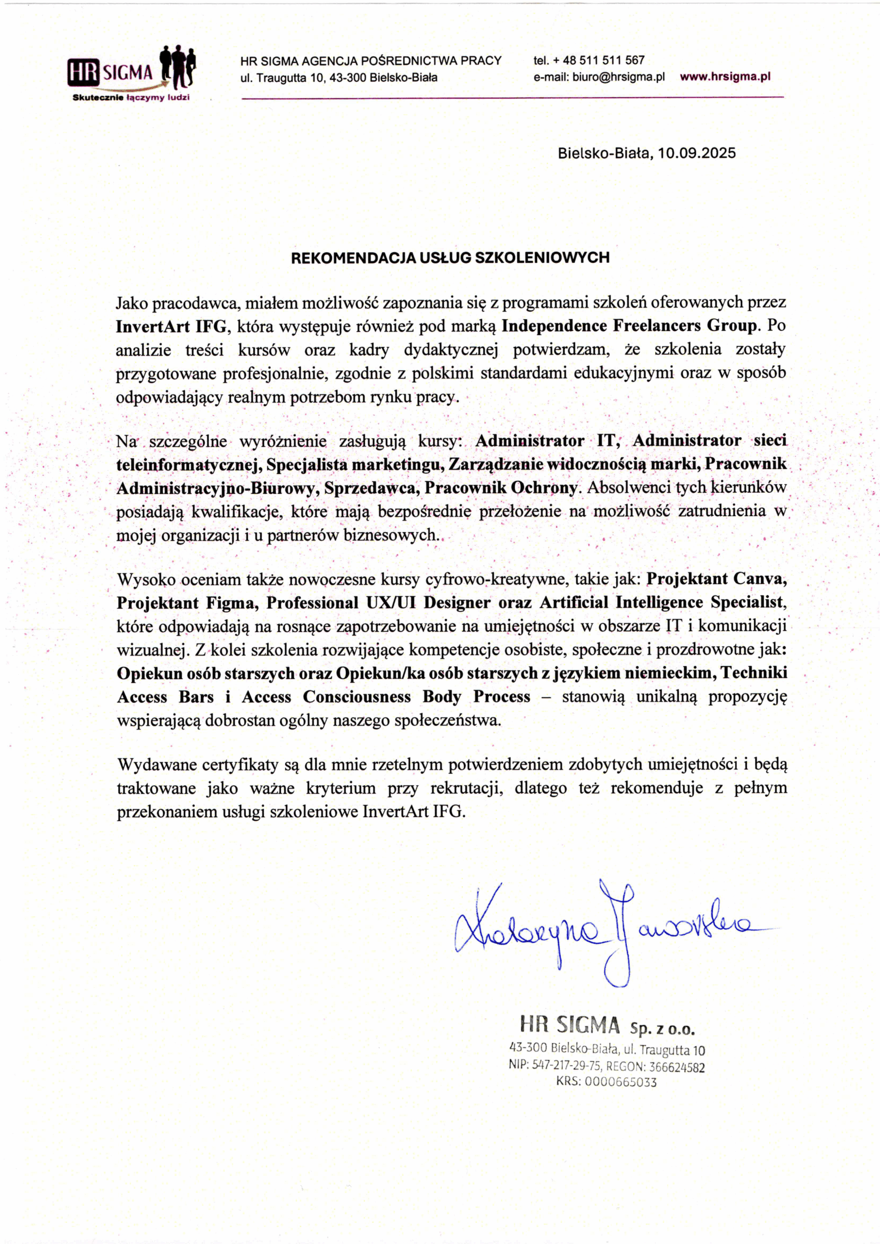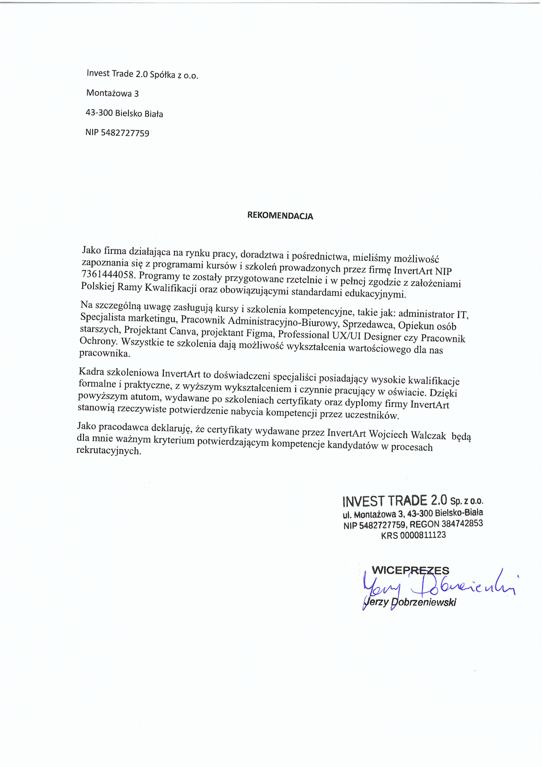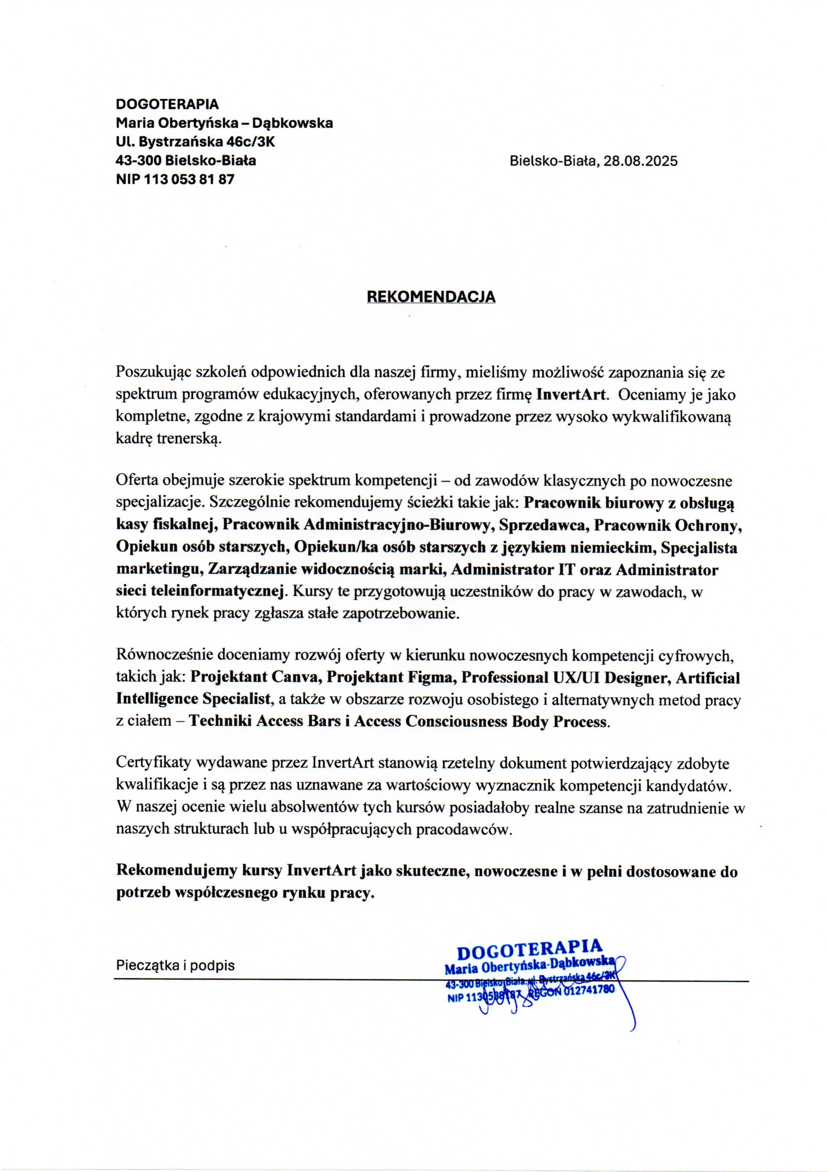 Poniżej potwierdzenia firm i instytucji uznających nasze kursy za wartościowe na rynku pracy. Te potwierdzenia są uznawane przez instytucje finansujące szkolenia z funduszy i dotacji.